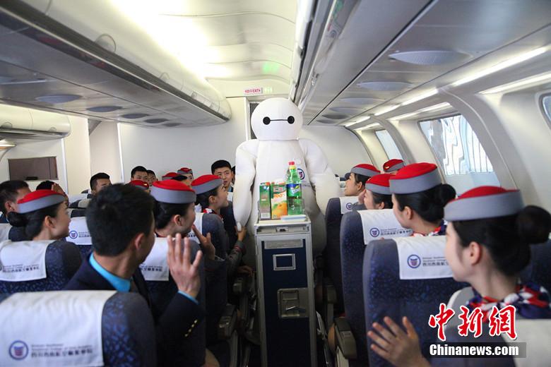 Photos of a flight attendant trainee in Baymax costume serving passengers have gone viral online. Baymax, a cute inflatable robot in recent animated feature film Big Hero 6, have won many Chinese people’s hearts. (Photo/ Zhong Xin)