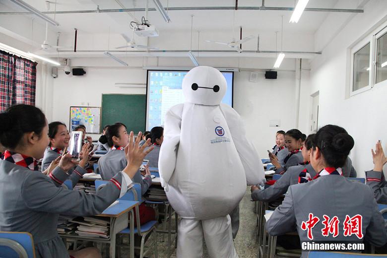 Photos of a flight attendant trainee in Baymax costume serving passengers have gone viral online. Baymax, a cute inflatable robot in recent animated feature film Big Hero 6, have won many Chinese people’s hearts. (Photo/ Zhong Xin)