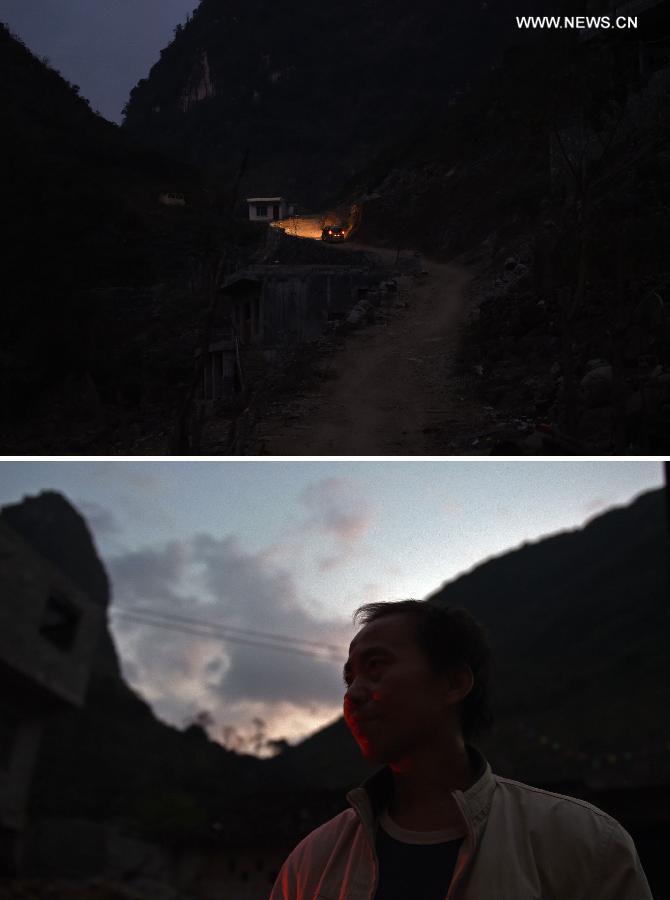 | The combined photo taken on Feb. 28, 2015 shows a car carrying Meng Guizhong's wife, two sons, daughter-in-law and grandchildren to work in the neighboring Guangdong Province, on a road in Nongding Village of Bansheng County, south China's Guangxi Zhuang Autonomous Region, and Meng Guizhong (lower) seeing them off. Nongding and Nongchao Villages are located in Bansheng County, a poor rural area of uninhabitable karst topography in Guangxi. After a short family reunion of the spring festival, young people of the two villages left their hometown again. Because of the topography and the weather, both of the two villages are unsuitable for farming. Working in east or south China's modern cities has become a major source of income for many local families and a preference for most young people. After helping their aged parents plant corns, some of them have to leave home at midnight to catch a coach in the countyseat to their faraway working places. (Xinhua/Huang Xiaobang) |