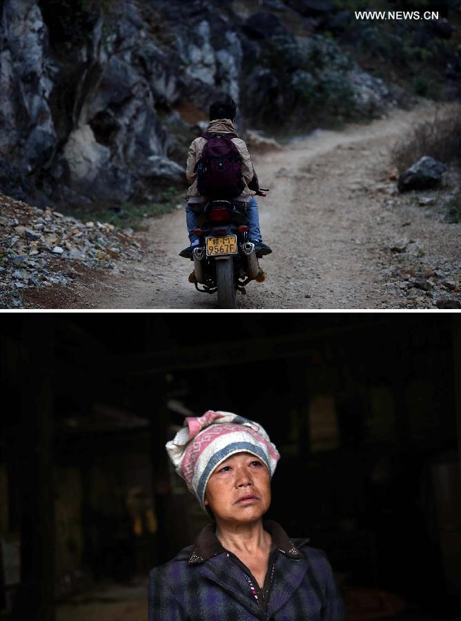 | The combined photo taken on March 2, 2015 shows the 25-year-old Lan Guiyuan (upper) leaving home by motorcycle in Nongchao Village of Bansheng County, south China's Guangxi Zhuang Autonomous Region, and his mother Meng Meiying (lower) seeing him off. Nongding and Nongchao Villages are located in Bansheng County, a poor rural area of uninhabitable karst topography in Guangxi. After a short family reunion of the spring festival, young people of the two villages left their hometown again. Because of the topography and the weather, both of the two villages are unsuitable for farming. Working in east or south China's modern cities has become a major source of income for many local families and a preference for most young people. After helping their aged parents plant corns, some of them have to leave home at midnight to catch a coach in the countyseat to their faraway working places. (Xinhua/Huang Xiaobang) |