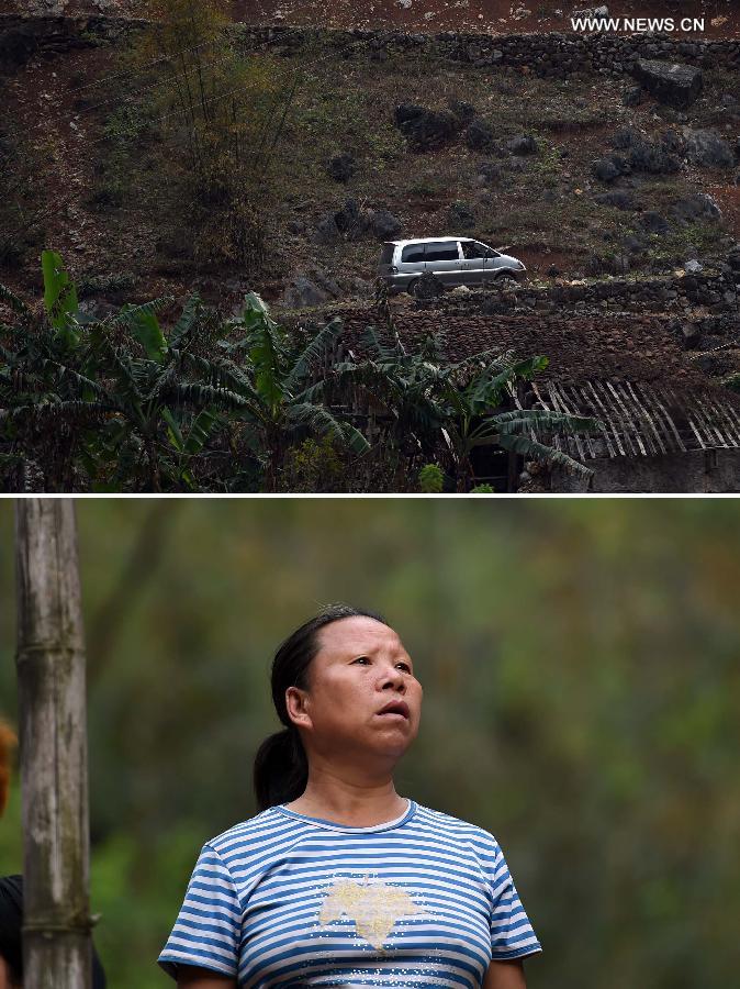 The combined photo taken on Feb. 27, 2015 shows a vehicle carrying 34-year-old Lan Guangbing and his little brother to work on a road in Nongchao Village of Bansheng County, south China's Guangxi Zhuang Autonomous Region, and their mother Meng Meijin (lower) seeing her sons off at the gate of their house. Nongding and Nongchao Villages are located in Bansheng County, a poor rural area of uninhabitable karst topography in Guangxi. After a short family reunion of the spring festival, young people of the two villages left their hometown again. Because of the topography and the weather, both of the two villages are unsuitable for farming. Working in east or south China's modern cities has become a major source of income for many local families and a preference for most young people. After helping their aged parents plant corns, some of them have to leave home at midnight to catch a coach in the countyseat to their faraway working places. (Xinhua/Huang Xiaobang)