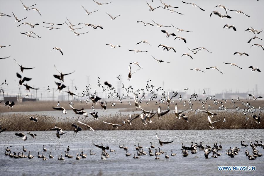 Birds fly at the Beidagang wetland in Tianjin, north China, March 21, 2015. The wetland's administrative staff recorded more than 6,000 migrant birds here, as the weather gets warmer. (Xinhua/Yue Yuewei)