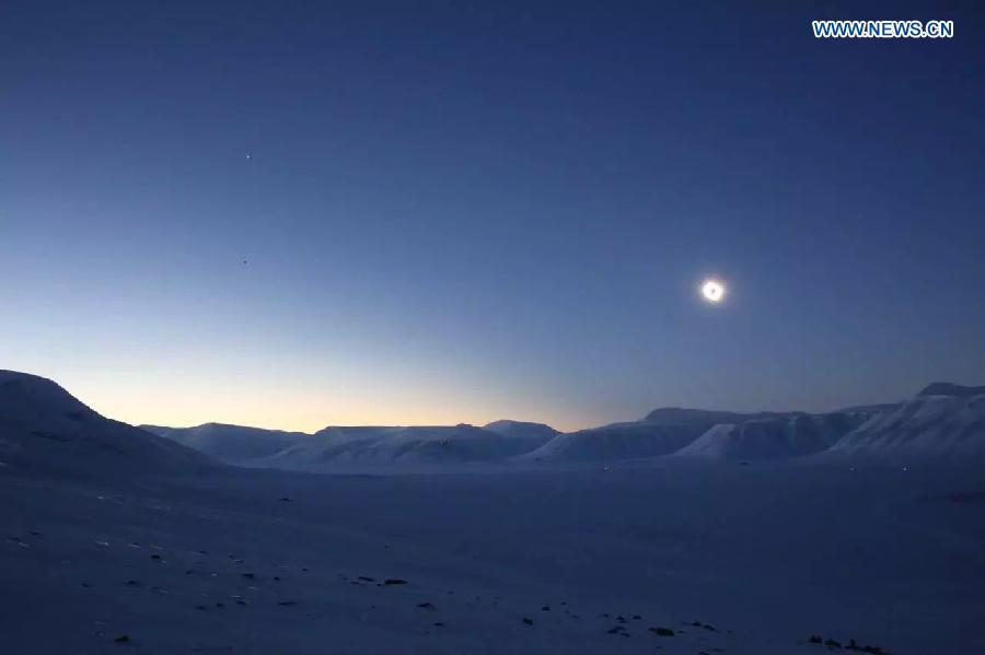 | hoto taken on March 20, 2015 shows the view during full solar eclipse in Longyearbyen, Norway. (Photo: Xinhua/Chen Haiying) |