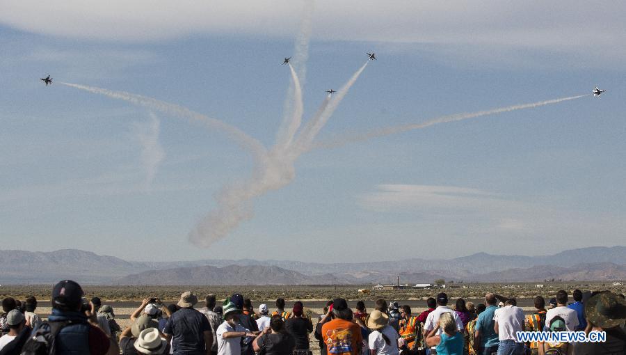 | People watch the U.S. Air Force Thunderbirds perform during the Los Angeles County Air Show at William J Fox Airport in Lancaster, California, the U.S., on March 21, 2015. (Xinhua/Zhao Hanrong) |