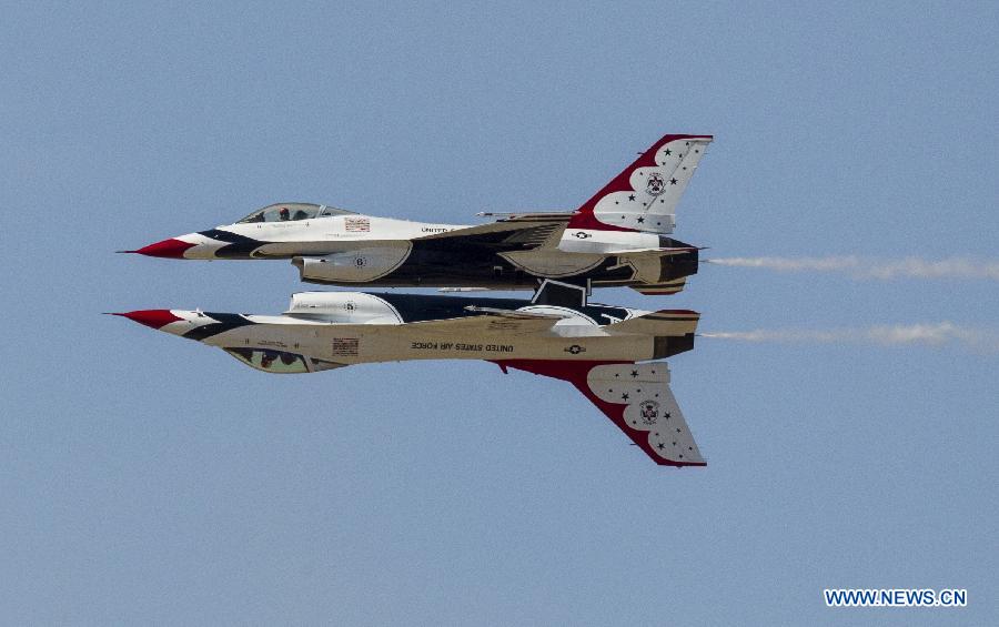 Planes of the U.S. Air Force Thunderbirds perform during the Los Angeles County Air Show at William J Fox Airport in Lancaster, California, the U.S., on March 21, 2015. (Xinhua/Zhao Hanrong)