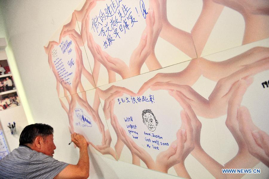 People write well-wishing messages for former Prime Minister Lee Kuan Yew at Singapore's Tanjong Pagar Community Club on March 22, 2015. Singapore's former prime minister Lee Kuan Yew has weakened further, the Prime Minister's Office (PMO) said on Sunday. (Xinhua/Then Chih Wey)