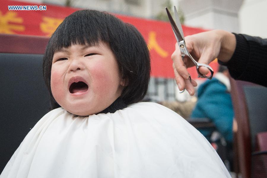 A child has a free haircut in Hefei, capital of east China's Anhui Province, March 21, 2015. March 21 is the second day of the second month in traditional Chinese lunar calendar this year. Folklore addresses it as "dragon lifting head", meaning the spring awakens after winter hibernation, when people usually have a haircut to bring good luck. (Xinhua/Du Yu)