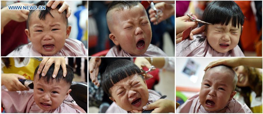 Combo photo shows children's expressions when having haircuts in Yinchuan, northwest China's Ningxia Hui Autonomous Region, March 21, 2015. March 21 is the second day of the second month in traditional Chinese lunar calendar this year. Folklore addresses it as "dragon lifting head", meaning the spring awakens after winter hibernation, when people usually have a haircut to bring good luck. (Xinhua/Wang Peng)