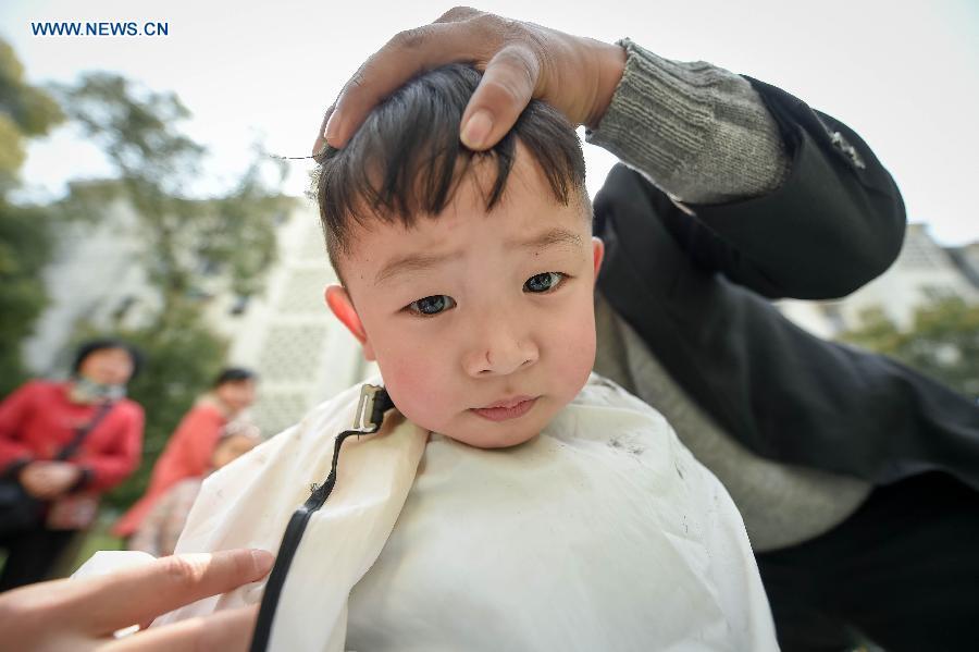| A child has a free haircut in Hefei, capital of east China's Anhui Province, March 21, 2015. March 21 is the second day of the second month in traditional Chinese lunar calendar this year. Folklore addresses it as "dragon lifting head", meaning the spring awakens after winter hibernation, when people usually have a haircut to bring good luck. (Xinhua/Zhang Duan) |