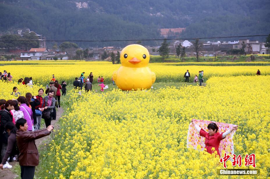 | Yellow rubber duck stands in field in E China's Jiangxi Province, March 21, 2015. (Photo: chinanews.com) |