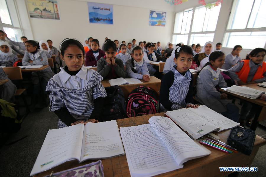 | Palestinian students attend a lesson at a UN-run school which is reopened after it was damaged during the war between Israel and Hamas militants in Khuzaa village of the southern Gaza Strip city of Khan Yunis, on March 22, 2015. (Xinhua/Khaled Omar) |