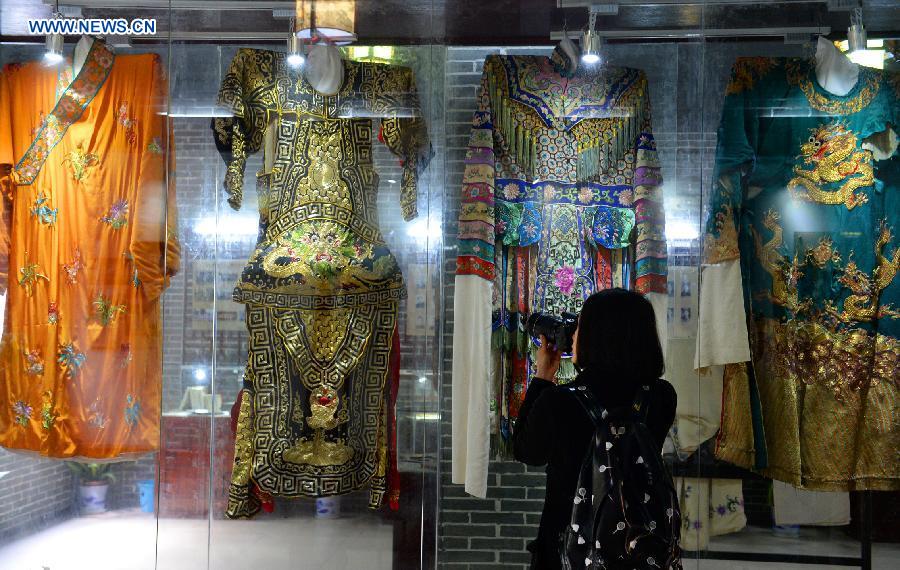 A visitor takes photos of performance costumes of Ganju Opera, one of the national intangible heritages, at the Ganju Opera museum in Nanchang, capital of east China's Jiangxi Province, March 22, 2015. China's first Ganju Opera museum, which introduced the origin, famous performers and development history of the traditional local opera, opened in Nanchang on Sunday. (Xinhua/Wan Xiang)