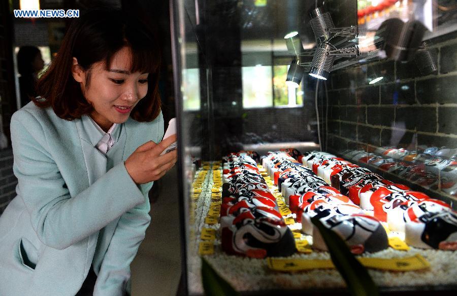 A visitor takes photos of facial makeup of Ganju Opera, one of the national intangible heritages, at the Ganju Opera museum in Nanchang, capital of east China's Jiangxi Province, March 22, 2015. China's first Ganju Opera museum, which introduced the origin, famous performers and development history of the traditional local opera, opened in Nanchang on Sunday. (Xinhua/Wan Xiang)
