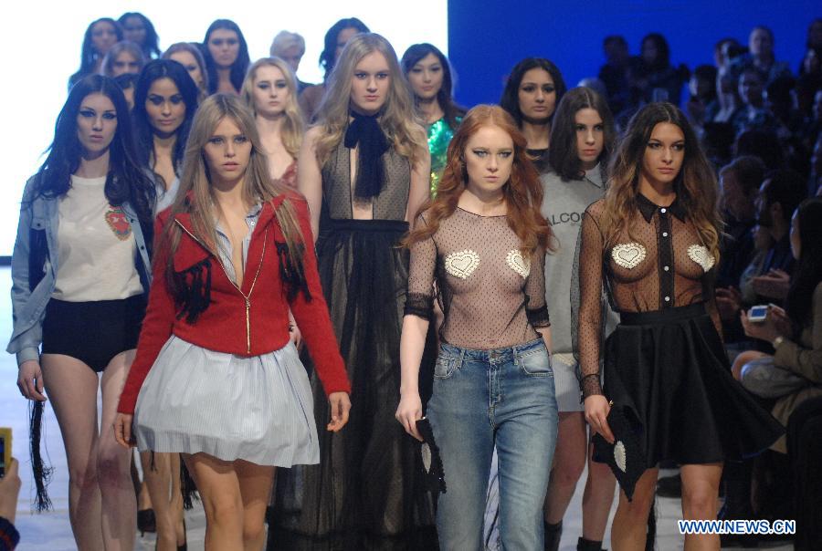 Models present creations of Italian designer Rocco Adriano Galluccio during the closing day of Vancouver Fashion Week Fall/Winter 2015 in Vancouver, Canada, on March 22, 2015. (Xinhua/Sergei Bachlakov)