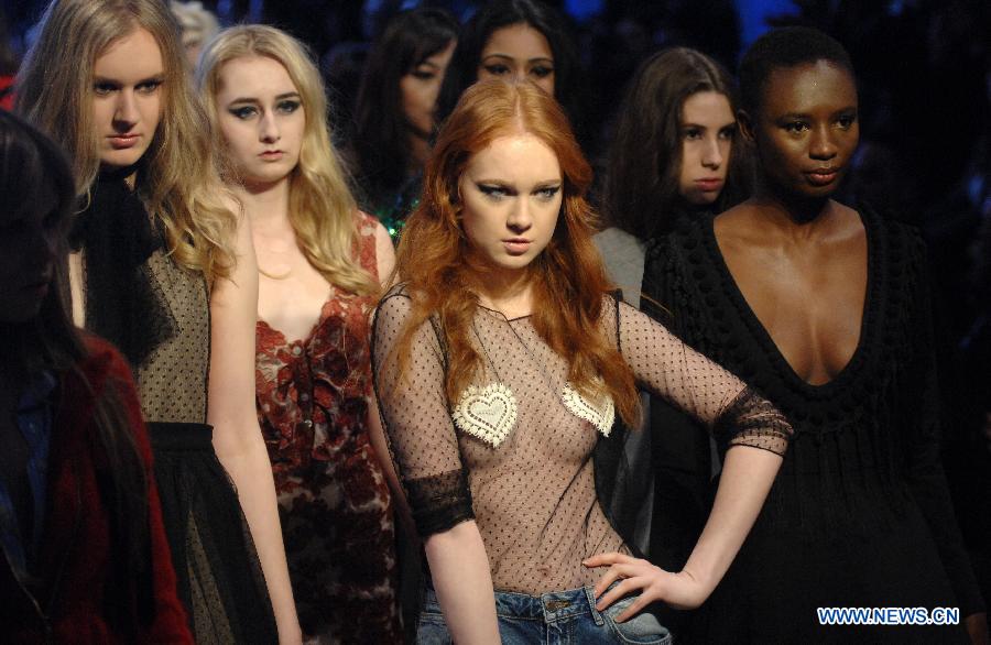 Models present creations of Italian designer Rocco Adriano Galluccio during the closing day of Vancouver Fashion Week Fall/Winter 2015 in Vancouver, Canada, on March 22, 2015. (Xinhua/Sergei Bachlakov)