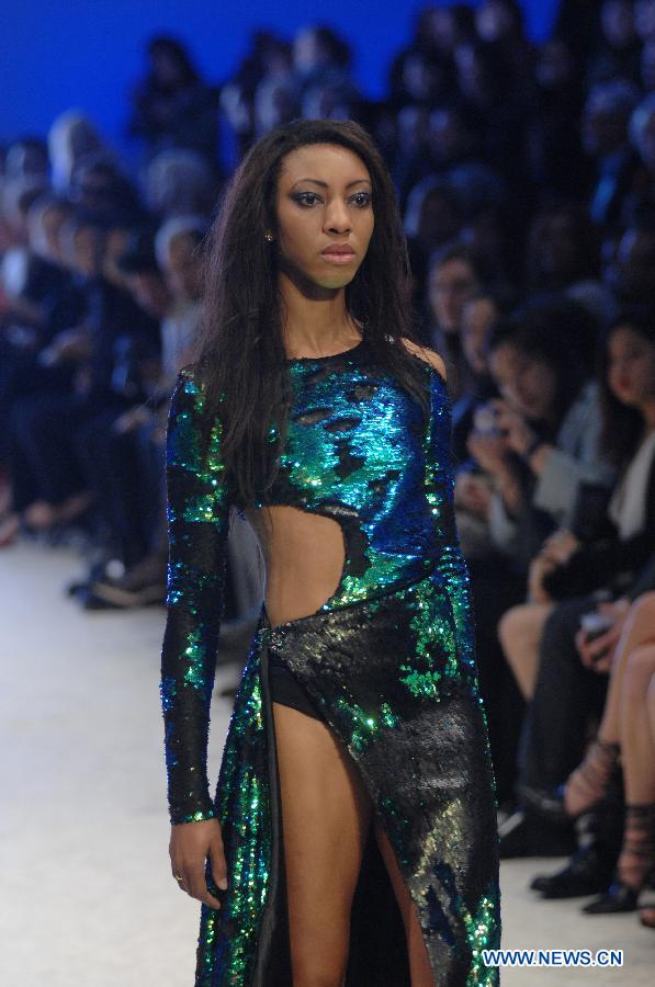 A model presents a creation of Italian designer Rocco Adriano Galluccio during the closing day of Vancouver Fashion Week Fall/Winter 2015 in Vancouver, Canada, on March 22, 2015. (Xinhua/Sergei Bachlakov)