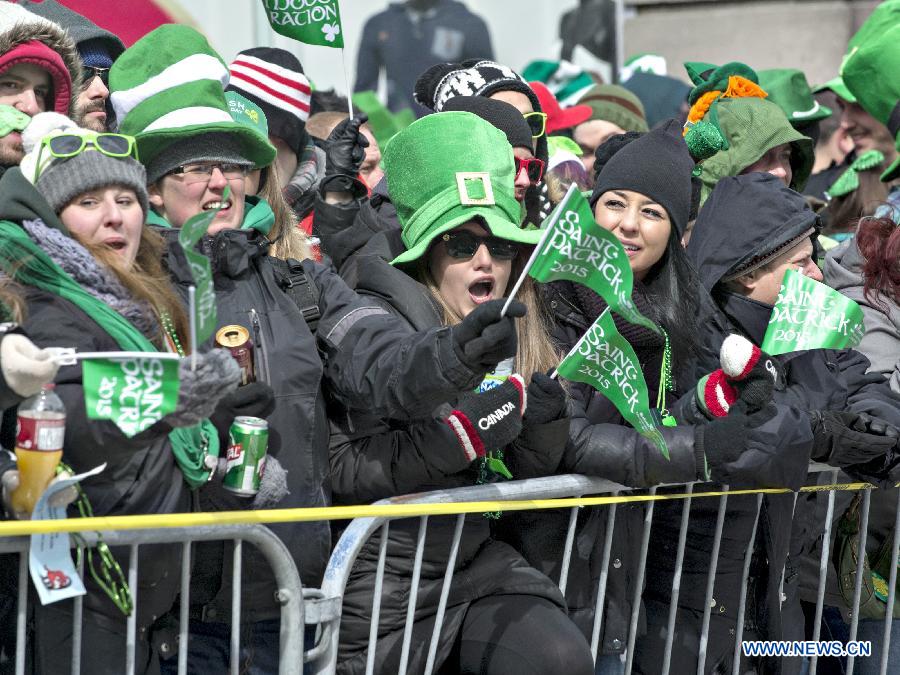 People celebrate the St. Patrick′s Day in downtown Montreal, Canada, March 22, 2015. (Xinhua/Andrew Soong)