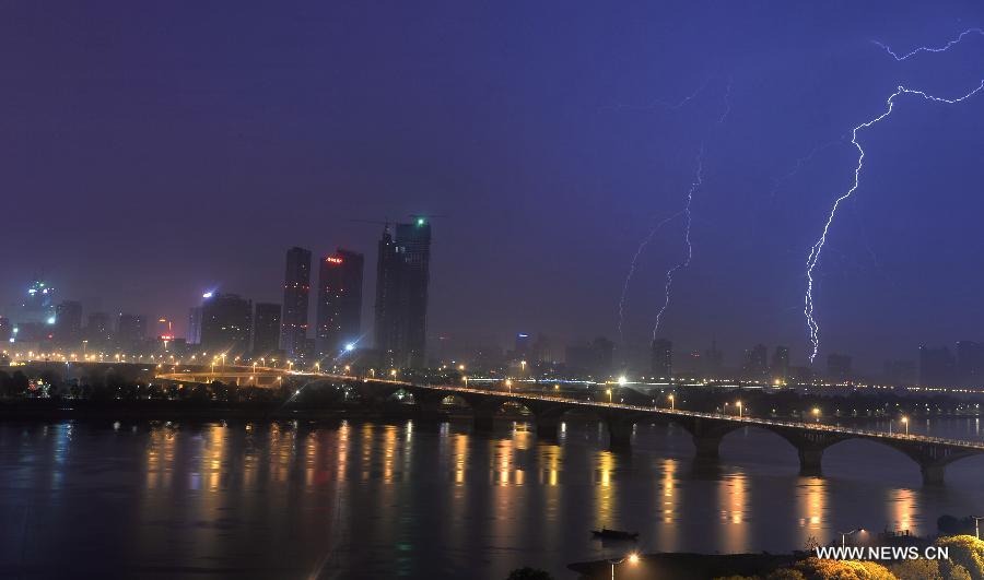 Lightning hits the sky above the urban areas along the Xiangjiang River in Changsha, capital of central China's Hunan Province, March 22, 2015. (Xinhua/Long Hongtao)