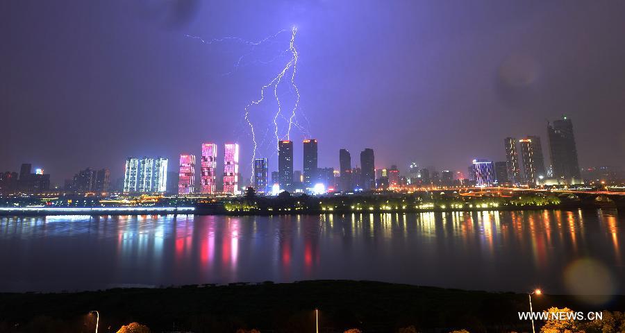 Lightning hits the sky above the urban areas along the Xiangjiang River in Changsha, capital of central China's Hunan Province, March 22, 2015. (Xinhua/Long Hongtao)