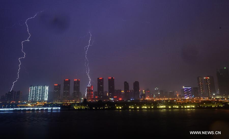 Lightning hits the sky above the urban areas along the Xiangjiang River in Changsha, capital of central China's Hunan Province, March 22, 2015. (Xinhua/Long Hongtao)
