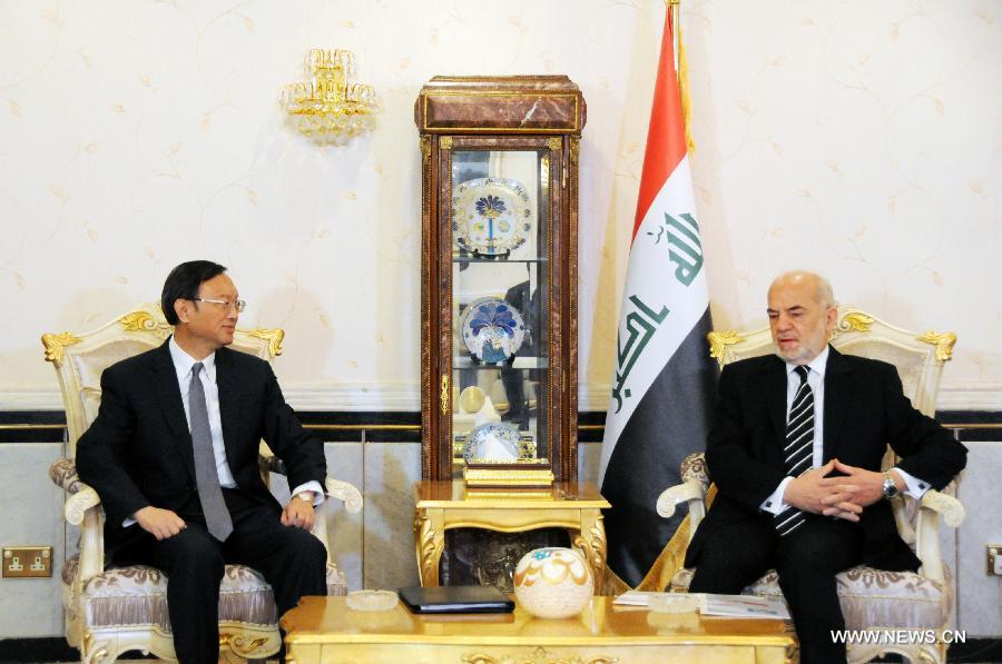 Chinese State Councilor Yang Jiechi(L) meets with Iraqi Foreign Minister Ibrahim al-Jaafari in Baghdad of Iraq on March 22, 2015. (Xinhua/Khaleem Kadhim)
