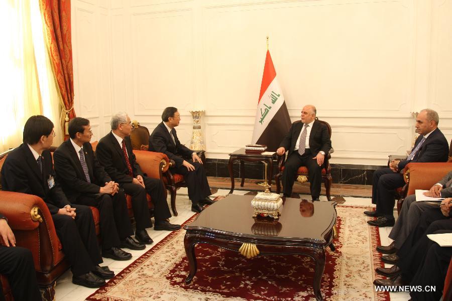 Chinese State Councilor Yang Jiechi(L-4) meets with Iraqi Prime Minister Haider al-Abadi(R-2) in Baghdad of Iraq on March 22, 2015. (Xinhua/Shang Le)