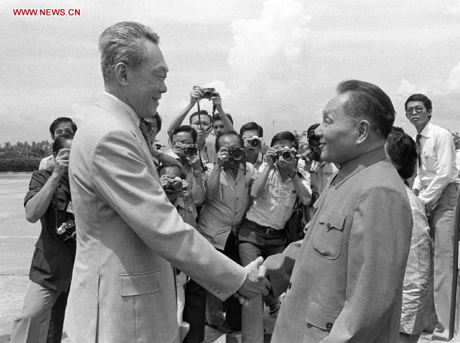 File photo taken on Nov.12,1978 shows Lee Kuan Yew (front, L) welcoming then Chinese Vice Premier Deng Xiaoping (front, R) in Singapore. Lee Kuan Yew, former prime minister of Singapore, died at 3:18 am on March 23, 2015 at the age of 91, according to a statement released by the Prime Minister's Office (PMO). (Xinhua/Zhang Guiyu)
