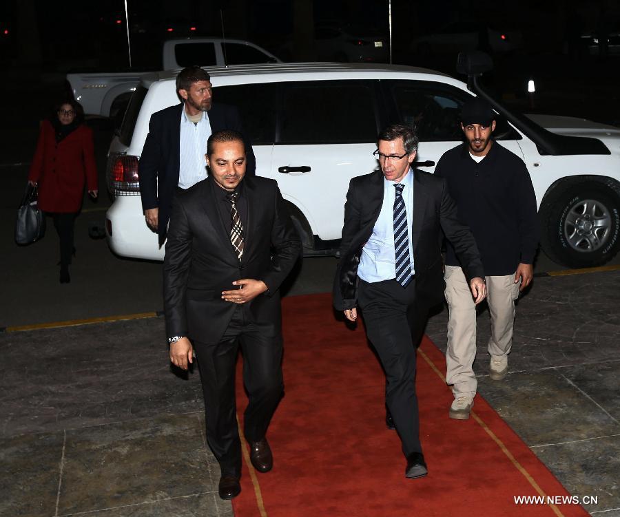 | The UN special envoy to Libya Bernardino Leon (2nd R) arrives to meet with President of the General National Congress (GNC) Nuri Abu Sahmain in Tripoli, Libya, on March 24, 2015. (Xinhua/Hamza Turkia) |