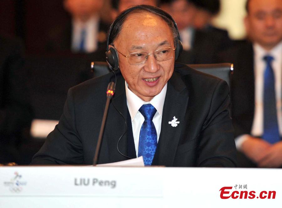 | China's Sports Minister Liu Peng delivers a speech at the opening ceremony of the inspection tour of Beijing, which has joined up with Zhangjiakou city in Hebei province to bid to co-host the 2022 Winter Olympics, March 24, 2015. (Photo provided to China News Service) |