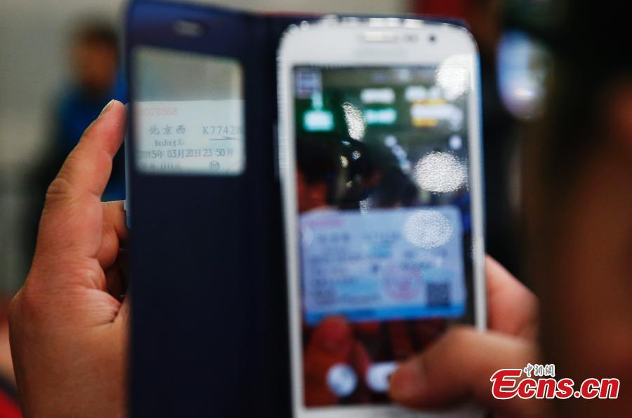 | A passenger takes the picture of the train ticket before taking the underground railway line that connects Beijing’s two major railway stations, March 20, 2015. The K7742 train from Shijiazhuang in Hebei province stops at the two stations before arriving at its destination Chengde, also in Hebei province. It takes 15 minutes for the train to travel the underground section, compared with the usual 40 minutes for passengers to transfer between the two stations using other public transport. Most passengers travelling to China's north and northeast have to depart from Beijing Railway Station, while those heading for the south board their trains at Beijing West Railway Station. The completion of the direct line between the two stations also marks the connection of the Beijing-Guangzhou Railway and the Beijing-Harbin Railway, two major railway lines in China. (Photo: China News Service/Liu Guanguan) |