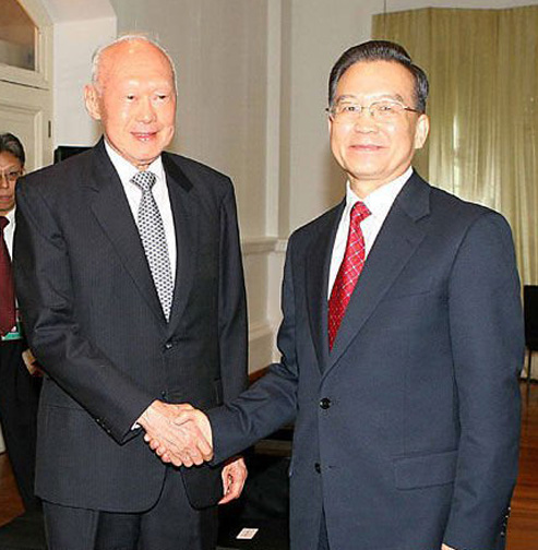 Chinese Premier Wen Jiabao meets with Lee Kuan Yew in Singapore, Nov 19, 2007. (Photo/Haiwainet.cn)