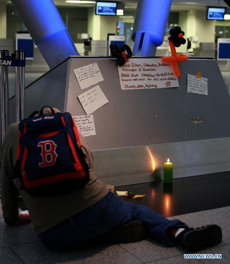 A passenger writes messages to mourn victims of the crashed plane of Germanwings at the airport in Duesseldorf, Germany, on March 24, 2015. An Airbus A320 of the German low-cost airline Germanwings with 150 people on board crashed on Tuesday in southern France, French authorities confirmed.(Xinhua/Luo Huanhuan)