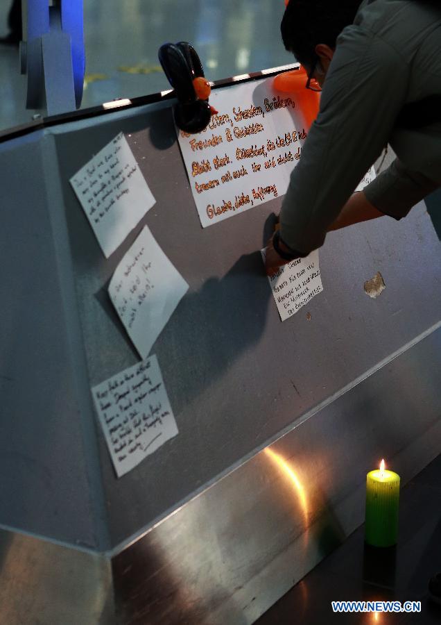 | A passenger leaves messages to mourn victims of the crashed plane of Germanwings at the airport in Duesseldorf, Germany, on March 24, 2015. An Airbus A320 of the German low-cost airline Germanwings with 150 people on board crashed on Tuesday in southern France, French authorities confirmed.(Xinhua/Luo Huanhuan) |