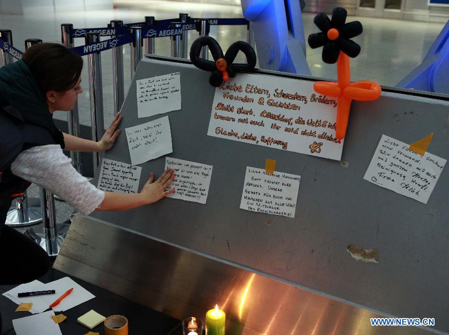 A passenger leaves messages to mourn victims of the crashed plane of Germanwings at the airport in Duesseldorf, Germany, on March 24, 2015. An Airbus A320 of the German low-cost airline Germanwings with 150 people on board crashed on Tuesday in southern France, French authorities confirmed.(Xinhua/Luo Huanhuan)