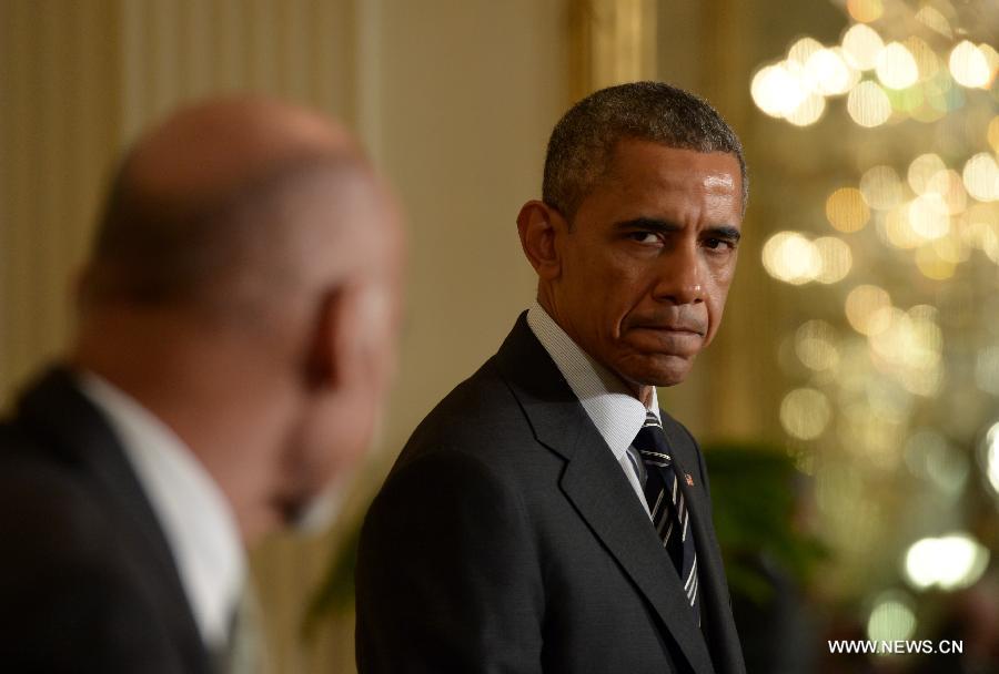 U.S. President Barack Obama(R) listens as Afghan President Ashraf Ghani speaks during a joint press conference in the East Room of White House in Washington D.C., the United States, March 24, 2015. U.S. President Barack Obama announced Tuesday no drawdown of the current 9,800 U.S. troops stationed in Afghanistan will occur through the end of 2015. (Xinhua/Yin Bogu)