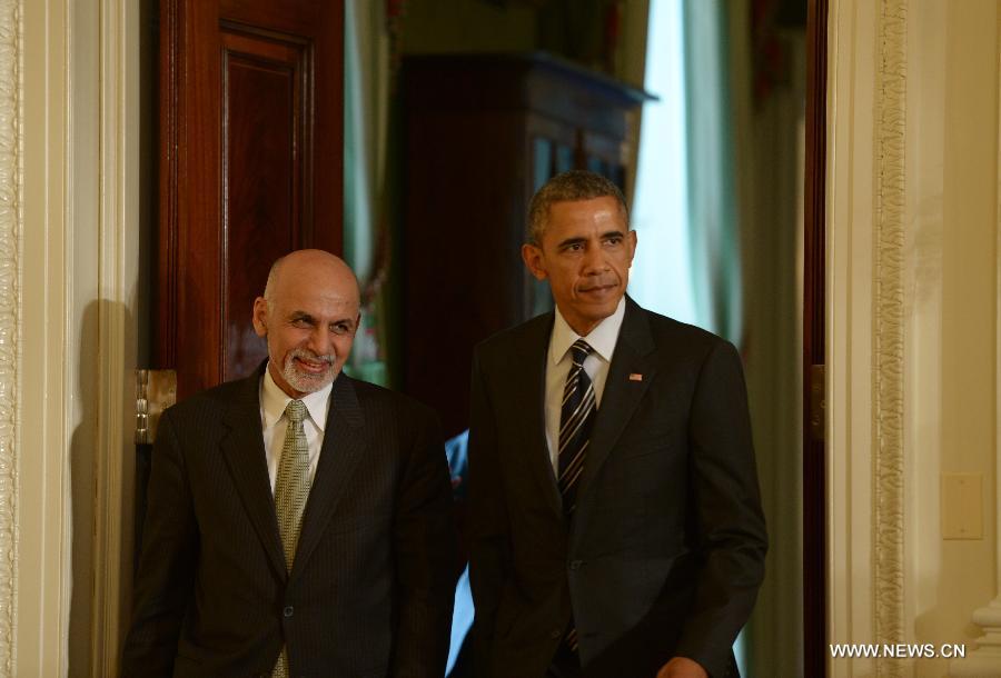 U.S. President Barack Obama(R) and Afghan President Ashraf Ghani arrive for a joint press conference in the East Room of White House in Washington D.C., the United States, March 24, 2015. U.S. President Barack Obama announced Tuesday no drawdown of the current 9,800 U.S. troops stationed in Afghanistan will occur through the end of 2015. (Xinhua/Yin Bogu)