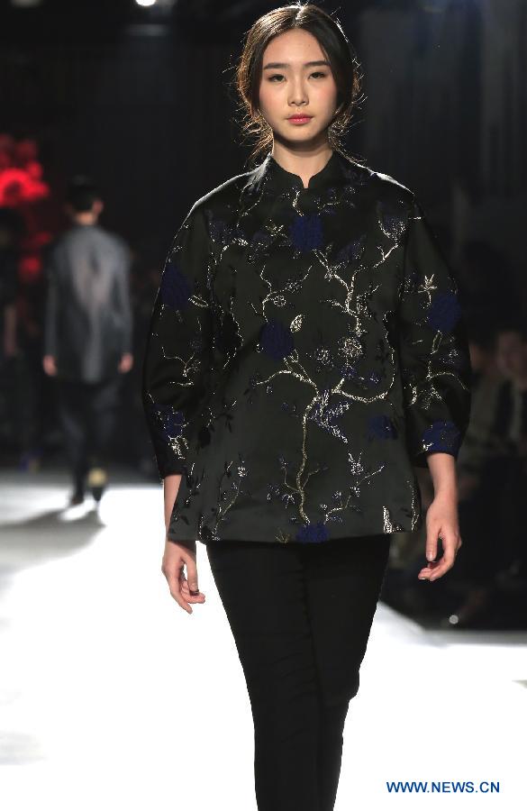 | A model presents a creation of Eve de Cina during the China Fashion Week A/W 2015/2016 in Beijing, capital of China, March 24, 2015. (Xinhua/Li Mingfang) |
