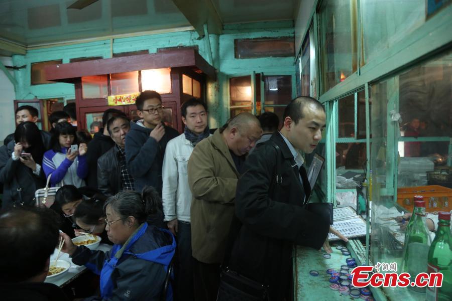 Customers queue to buy noodles in the time-honored Xincheng Noodle House in Qianmen, downtown Beijing, March 24, 2015. The 60-year-old restaurant will close on March 25 due to rocketing rents. It started as a private noodle house and was then nationalized in 1956. Later, it was operated by private owners, featuring the same decor, products and even staff for decades, and has become a mainstay in Qianmen where many historic buildings have been razed in recent years as part of the street's modernization. (Photo: China News Service/Liu Xianguo)
