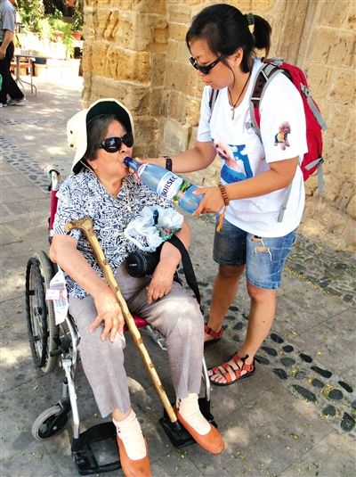 Anrong helps her mother to have a drink on a visit to Cyprus. (Photo/Provided by Anrong)