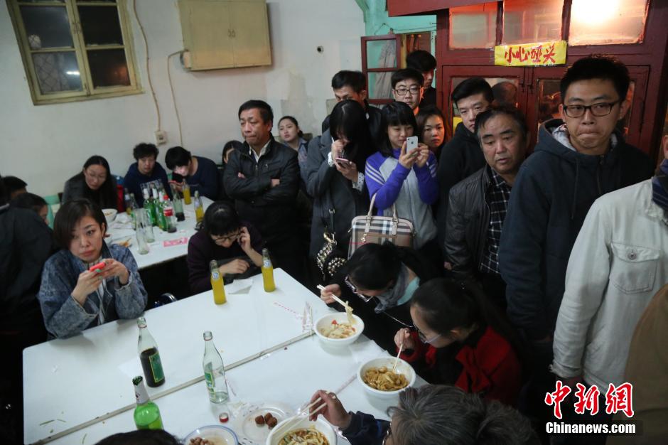 Many old customers stand in line to eat at Xin Cheng Noodle House for the last time, March 24, 2015. (Chinanews/Liu Xianguo)