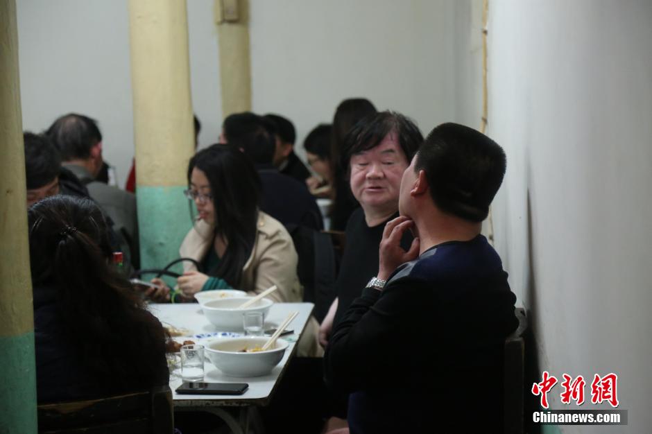Many old customers stand in line to eat at Xin Cheng Noodle House for the last time, March 24, 2015. (Chinanews/Liu Xianguo)