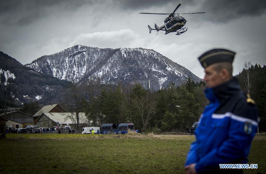 A rescue helicopter sets off to the crash site of Germanwings Airbus A320 plane in the Alps in southern France, March 25, 2015. French gendarmes late Tuesday found one of the two black boxes of the German passenger plane that crashed in southern France with 150 people on board, while a joint international probe into the cause of the accident is under way. (Xinhua/Chen Xiaowei)