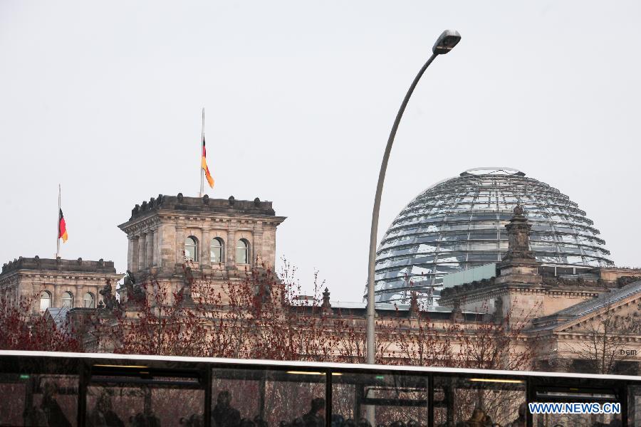 A bus drives by as German national flags fly at half mast on the Reichstag building (the lower house of parliament) to commemorate the victims of the crashed plane of Germanwings in Berlin, Germany, on March 25, 2015. An Airbus A320 of the German low-cost airline Germanwings with 150 people on board crashed on Tuesday in southern France. (Xinhua/Zhang Fan)