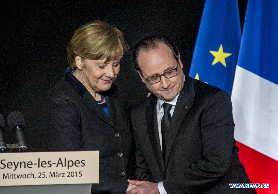 French President Francois Hollande (R) shakes hands with German Chancellor Angela Merkel during a press conference in Seyne-les-Alpes, France, March 25, 2015. (Xinhua/Chen Xiaowei)