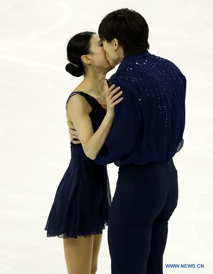 Tong Jian of China kisses his parter Pang Qing after their Pairs Short Program session in ISU World Figure Skating Championships 2015 at Crown Indoor Stadium, Oriental Sports Center in Shanghai, China on March 25, 2015. Pang Qing and Tong Jian took the second place after short program with 72.59 points. (Xinhua/Wang Lili)