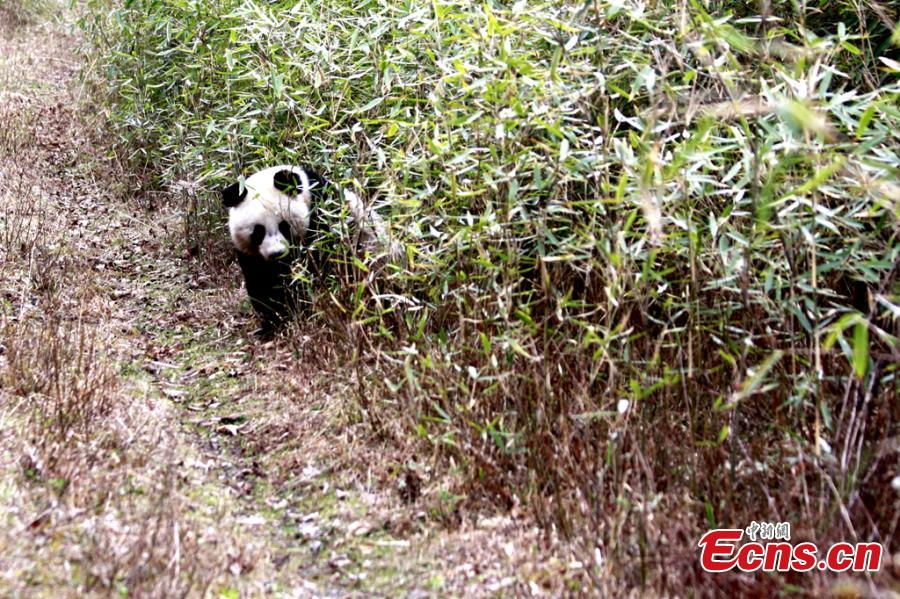 | A giant panda eats bamboo at the Changqing Nature Reserve. A report of the fourth panda survey in Shaanxi province, released on March 25, shows that there are about 345 wild giant pandas living in the Qinling Mountains area, an increase of 26.4 percent than the third survey. Most pandas live on the southern slope of the middle section of Qinling Mountains. (Photo provided to China News Service) |
