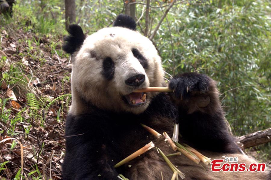 A giant panda eats bamboo at a nature reserve. A report of the fourth panda survey in Shaanxi province, released on March 25, shows that there are about 345 wild giant pandas living in the Qinling Mountains area, an increase of 26.4% than the third survey. Most pandas live on the southern slope of the middle section of Qinling Mountains. (Photo provided to China News Service)