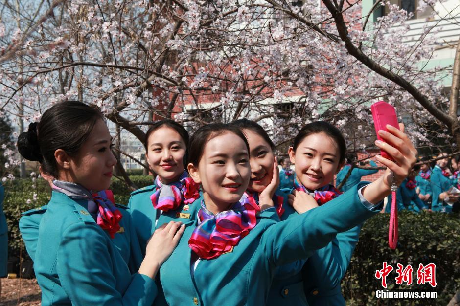 Students of Civil Aviation University of China change new school uniforms on March 24, 2015. The students are from the Flight Techniques College and Cabin Attendant College. (Chinanews/Pang Jie)