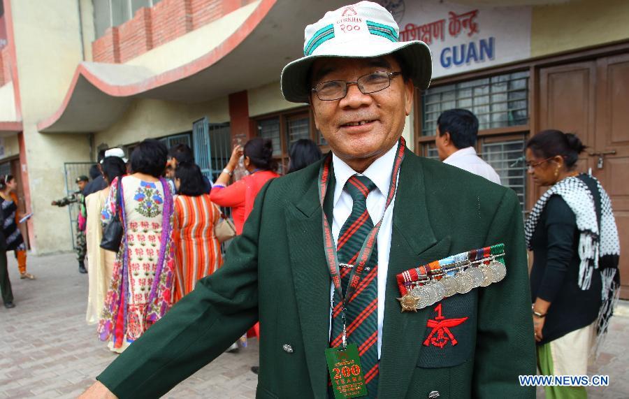A retired British Gurkha participates in the commemoration of 200 years of service in the British Army in Kathmandu, Nepal, March 26, 2015. The United Kingdom's Brigade of Gurkhas commemorates 200 years of outstanding service and loyalty to the crown in 2015. (Xinhua/Sunil Sharma)