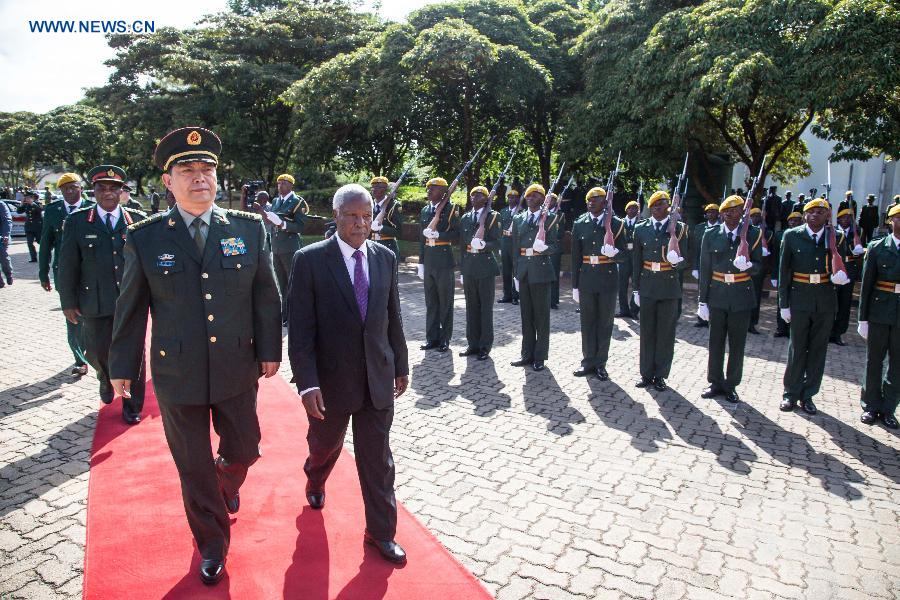 Chinese State Councilor and Defense Minister Chang Wanquan(L) and Zimbabwean Defense Minister Sydney Sekeramayi inspect the guards of honor before their meeting in Harare, Zimbabwe, on March 26, 2015. Chinese State Councilor and Defense Minister Chang Wanquan on Thursday pledged to continue bilateral military exchanges and deepen cooperation between the armies of China and Zimbabwe as he wrapped up his two-day visit to the southern African country. (Xinhua/Xu Lingui)